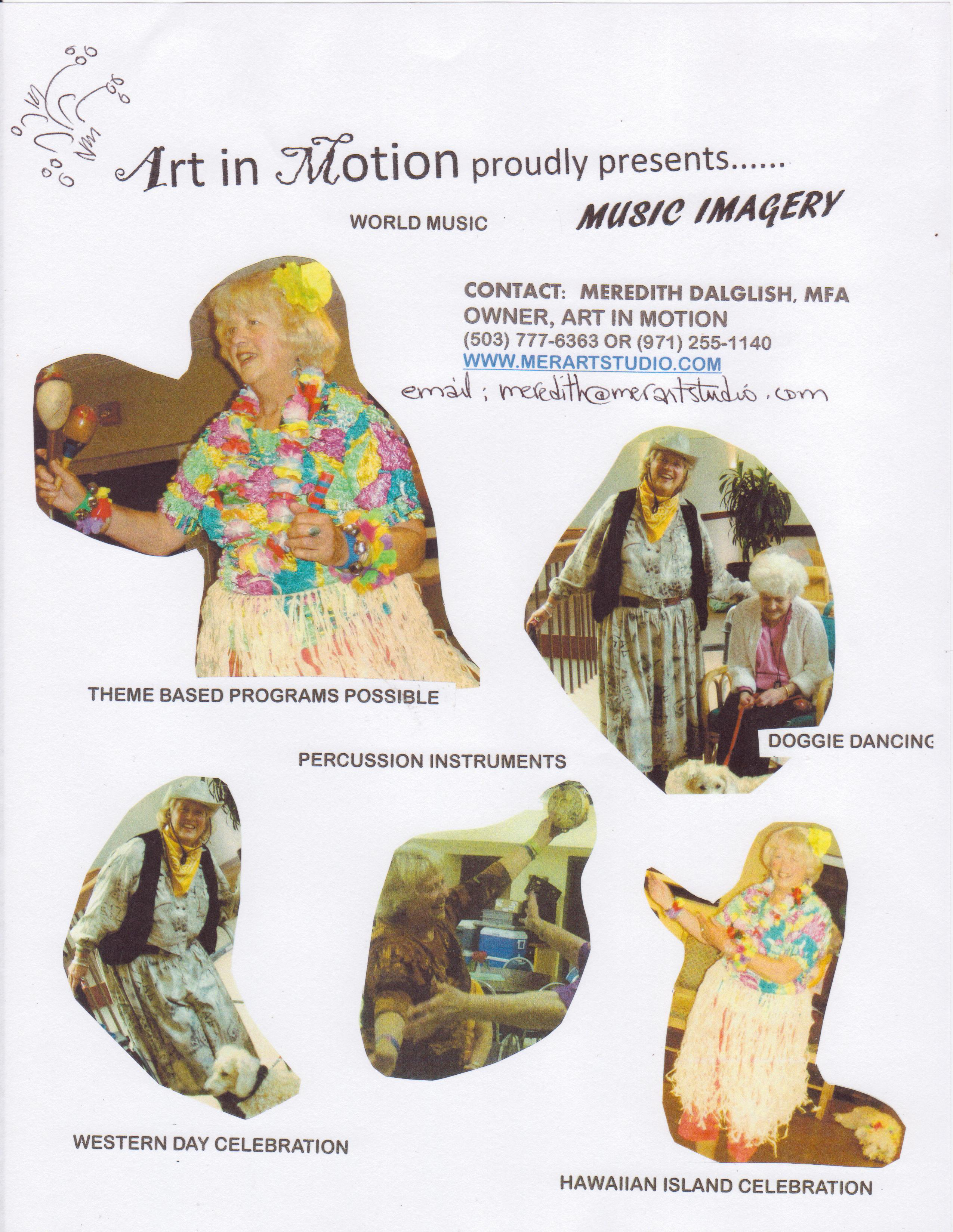 Participatory in a circle, cd’s world music, percussion instruments, as seniors imagine travel to far distant lands, or where they lived at one time, and includes body stretches, informal movement to music and kazoo playing by Meredith.